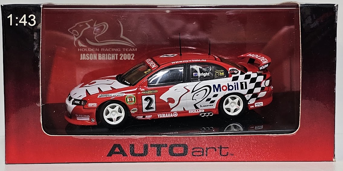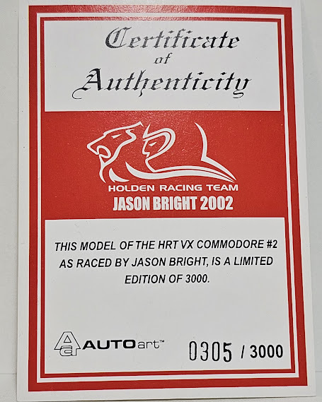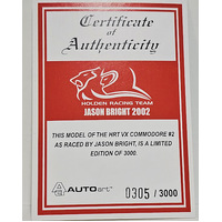 New Signed 1:43 Holden VX Commodore HRT 2002 Jason Bright . It has been personally signed by Jason Bright. There is light peeling of the protective coating on the box from age