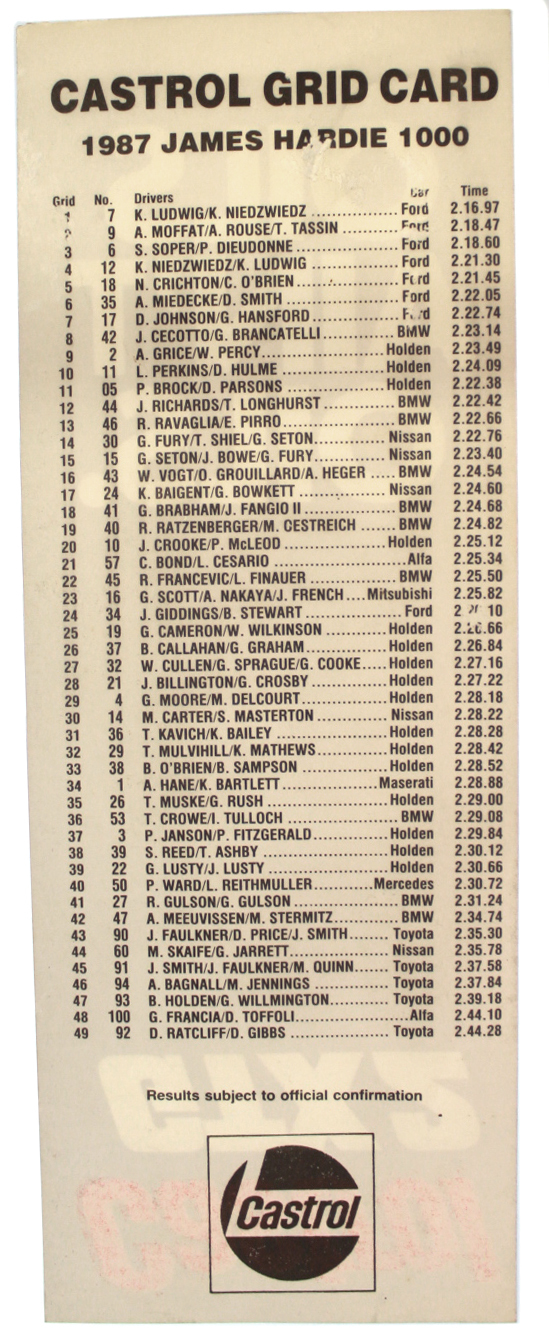 This is a genuine Castrol Bathurst grid card from the 1987 James Hardie 1000