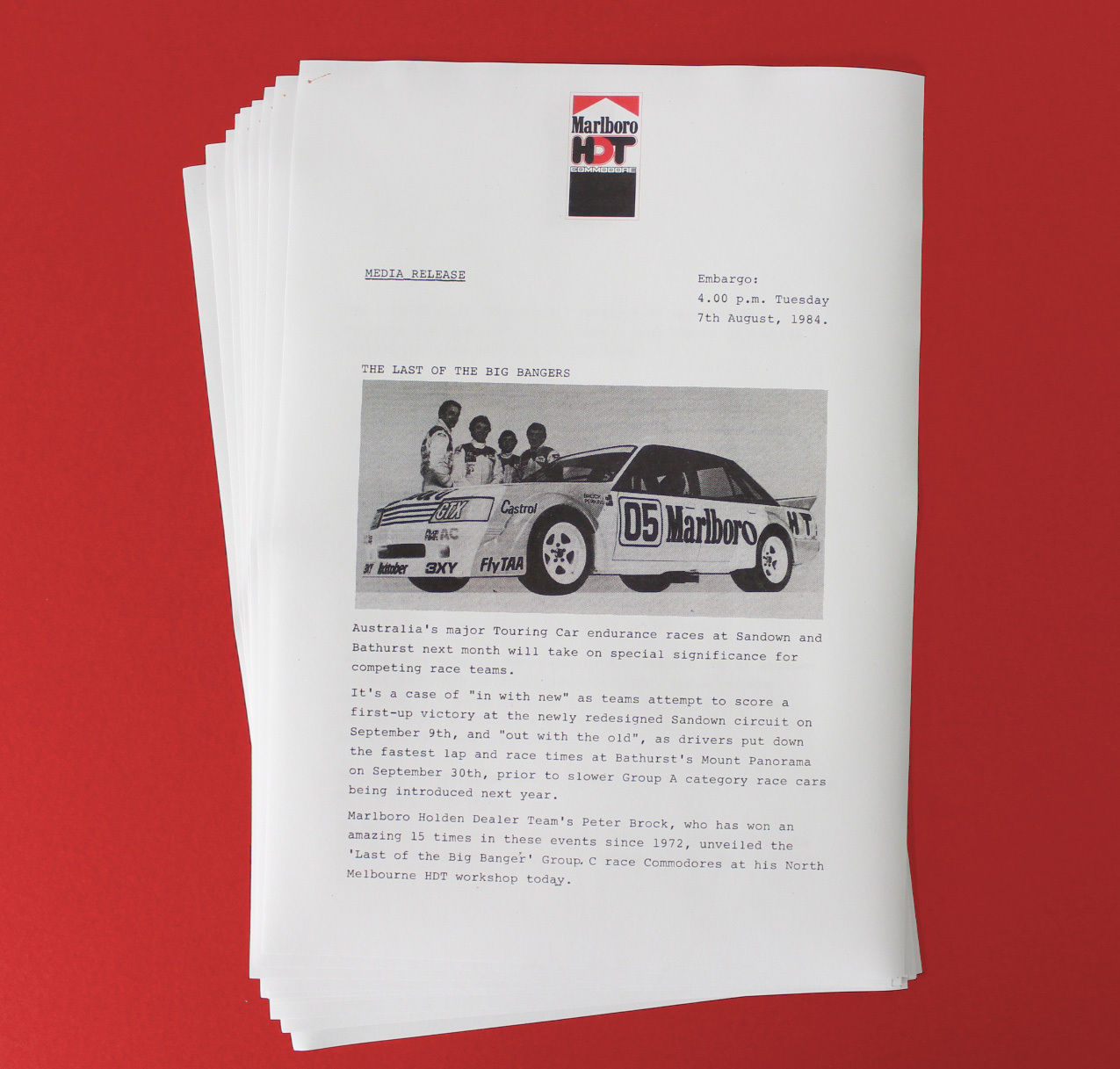 Here is a copy of an original media kit from my private collection, "Last of the Big Bangers". The twin VK model Commodore, restyled in eye-catching Marlboro international livery, are a good chance to rewrite the record books over the coming month. Brock's driver line-up includes himself and dual Bathurst winner Larry Perkins in car 05, while MHDT veteran and 1983 Bathurst co-winner John Harvey will pair with up and coming Tasmanian, David Parsons, in the second team Commodore. This includes 10 pages covering